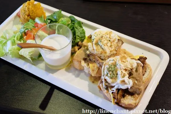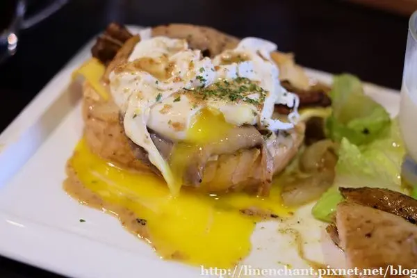 半熟的班尼迪克蛋下面有炒過的野菇,底層鋪了口感很有鬆軟的麵包...在淋上胡麻醬吃起來好香好美味喔!!!