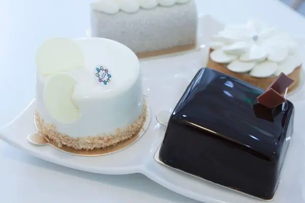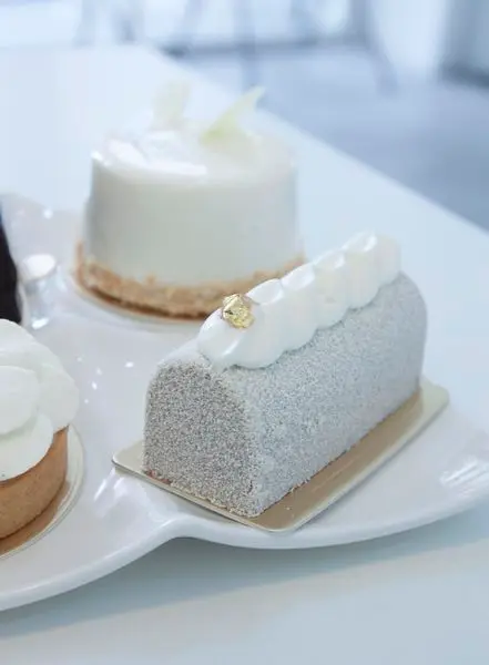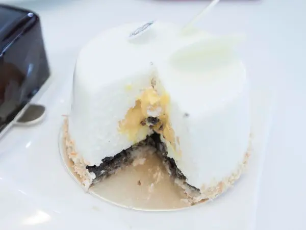 "白巧克力鏡面、椰子慕絲、芒果百香果奶餡、椰子達克瓦茲、黑芝麻脆片"