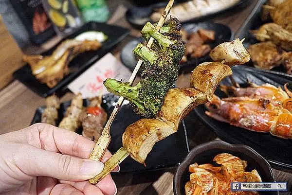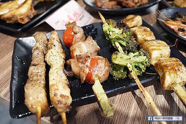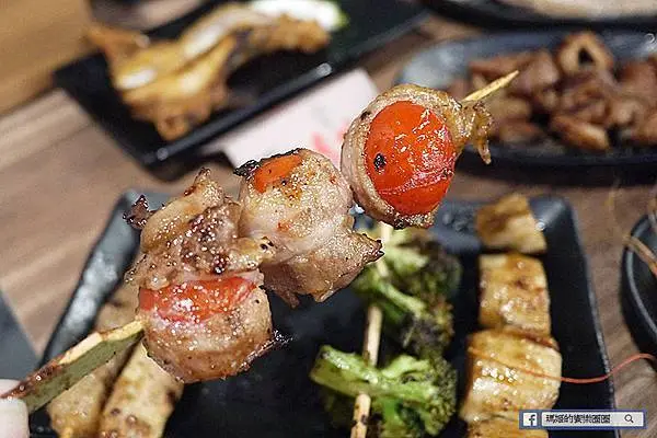 這一盤串燒有豬肉、雞肉、蕃茄培根、花椰菜和杏鮑菇