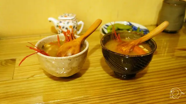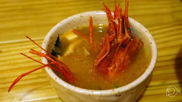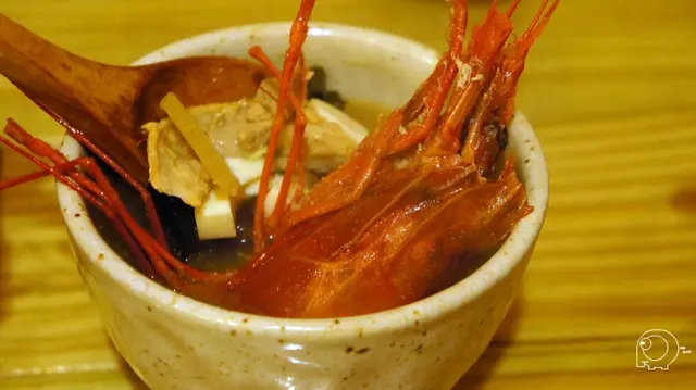每一碗都有一個大蝦頭跟一些碎魚肉