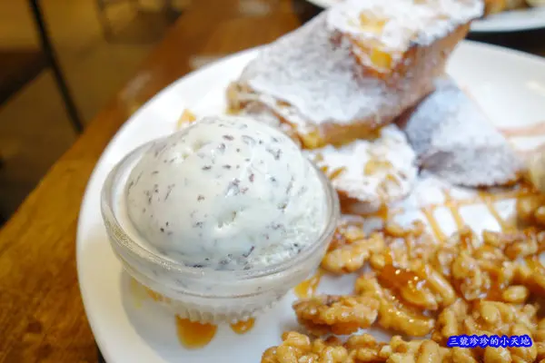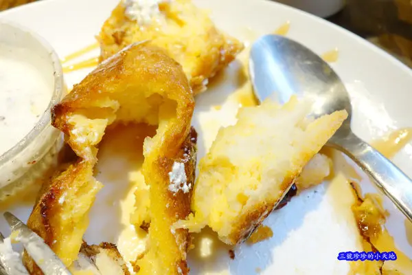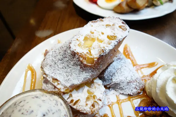 至於布丁吐司的部份,以珍珍個人的口味及口感來說,不是很合我就是了,可能蛋液浸泡的時間還不夠久,所以麵包外層吃起來還挺乾硬,中間部份倒是挺柔軟的,在吃的時候會覺得整個很不搭,沒有一致性,還有一旁的鮮奶油打發得不夠細緻!沒辦法呀~珍珍我是鮮奶油控呀!