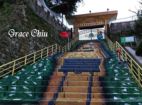 我快走到阿柑姨時從上面走下來的遊客熱心的告訴我往上走就是九份國小,說那的階梯有彩繪可以拍,於是我就再走了幾階抵達九份國小,從阿柑姨店門口再往上多走幾步就會到,不過我之前一次也沒上到這來哩.