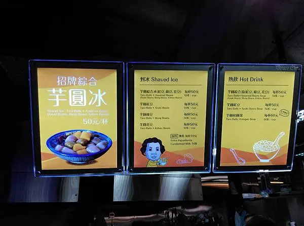 阿柑姨的餐點有冷的跟熱的可以點,除了冬季限定的芋圓桂圓湯是60元外其他都是50元,我點了招牌綜合芋圓冰(芋圓綜合冰),是芋圓+紅豆+綠豆+花豆的組合.
