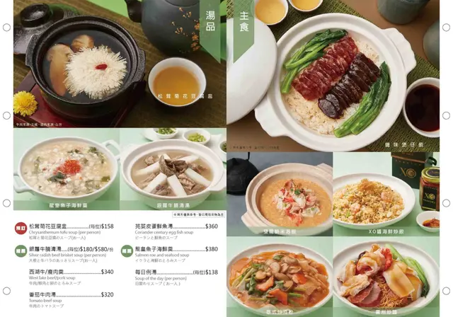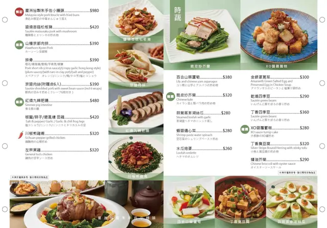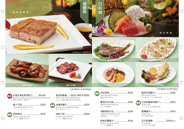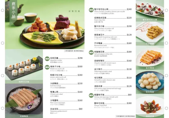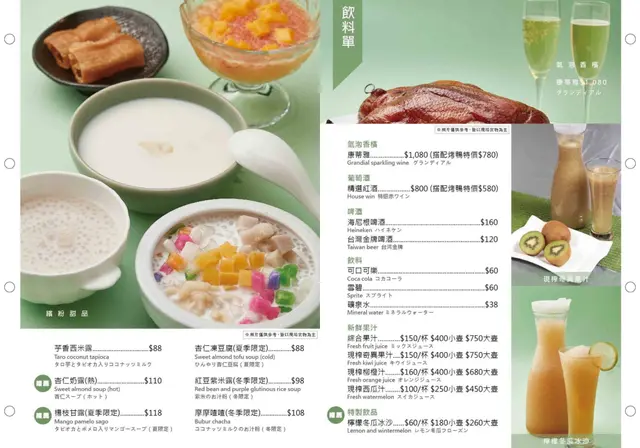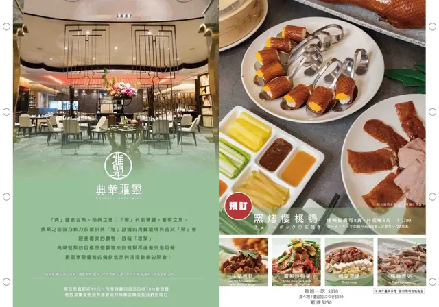 典華雅聚新莊店的餐點選擇非常多,窯烤櫻桃鴨提供了六種吃法,是來到典華雅聚必吃的菜色,其他還有燒臘類、日料類、撚手小品、鮑參翅肚、生猛海鮮、煲煲好、肉類、時蔬、湯品、主食、港式點心及飲料。