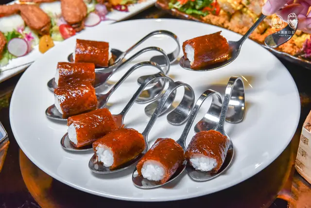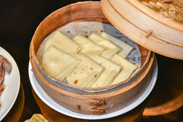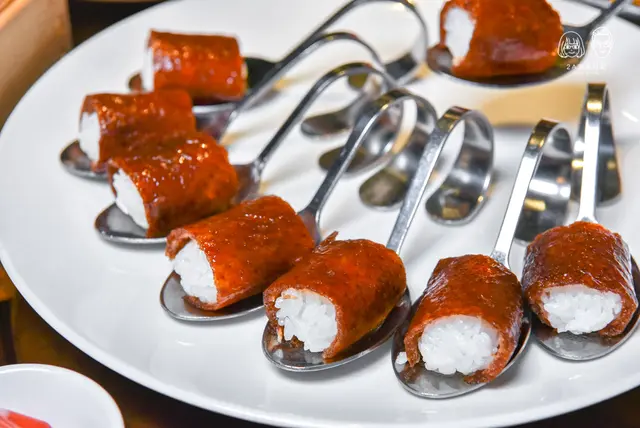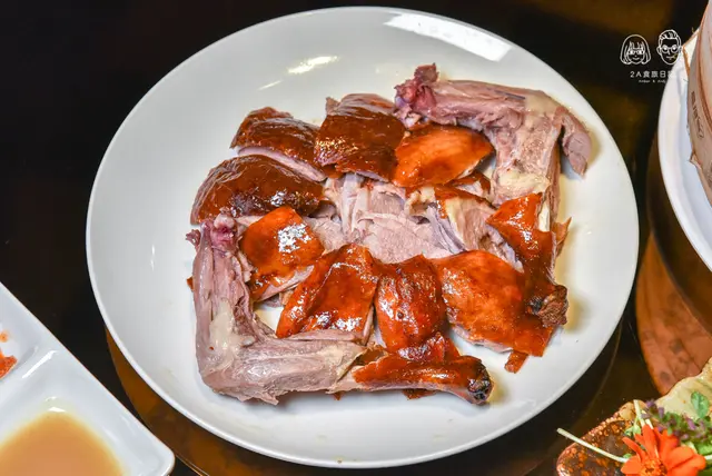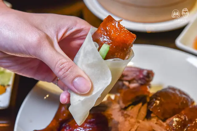 片皮鴨一共有八份,可以自己動手包,醬料有多種選擇,軟Q的薄餅搭配宜蘭三星蔥、 小黃瓜及甜麵醬,是大人小孩都喜愛的料理,一口咬下便可感受到濃郁的鴨肉香,加上青蔥及小黃瓜的口感層次更加鮮明且爽口。