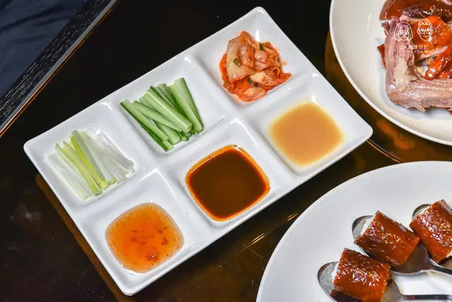 除了片皮鴨的甜麵醬,還有味噌醬、冰梅醬及韓式泡菜可搭配窯烤櫻桃鴨,讓鴨肉有著不一樣的吃法及風味。