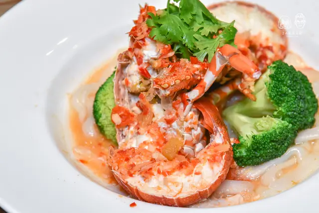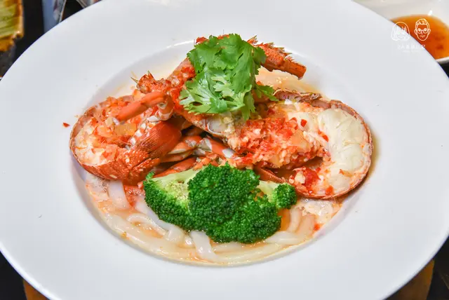 清蒸龍蝦完整保留龍蝦的鮮甜,肉質扎實很有彈性,吸附泰式醬汁的口味酸蘇辣辣的,很是開胃,而且龍蝦頭也吃得到肉~愛吃酸、愛吃辣的朋友必點,底下的河粉非常彈牙還帶點咬勁,同時充分吸收了醬汁精華,口味清爽酸辣,越吃越涮嘴,這道我也超愛!