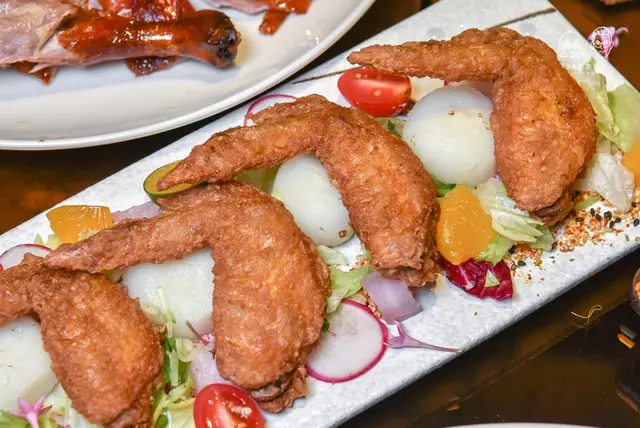 擺盤超美的聞雞起舞以六隻雞翅、桂花馬蹄、生菜、小番茄、食用花擺盤而成,雞翅麵衣薄薄一層且酥酥脆脆的,肉質則軟嫩保有雞汁,口味鹹香不過重,單吃就好吃~加上清脆爽口的馬蹄很耐吃,這道當小菜很可以!