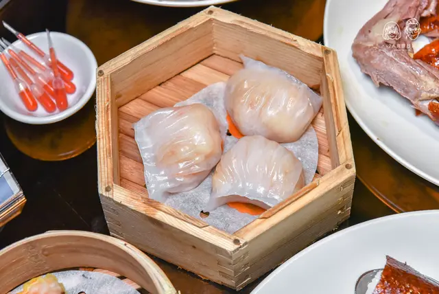 喜歡吃港點的人一定要點這道晶瑩鮮蝦餃皇!超大一顆的蝦餃非常飽滿,在吃之前,可以將一根根的紅醋注入到餃子裡,讓餃子更加爽口鮮甜。