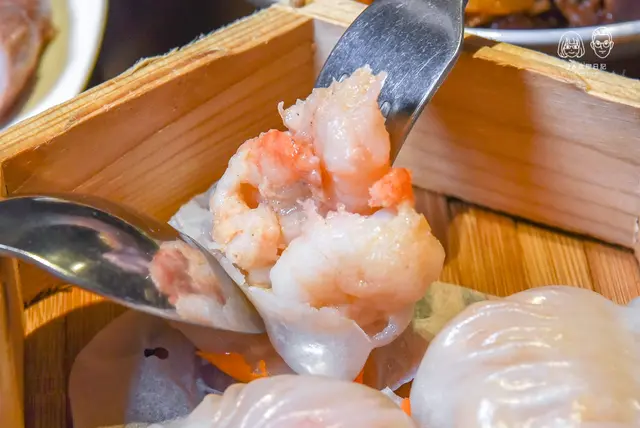 鮮蝦餃皇的餃子皮薄薄QQ的,而餡料之所以會這麼鼓,原來是裡面有三塊完整的蝦子!這也太真材實料了!