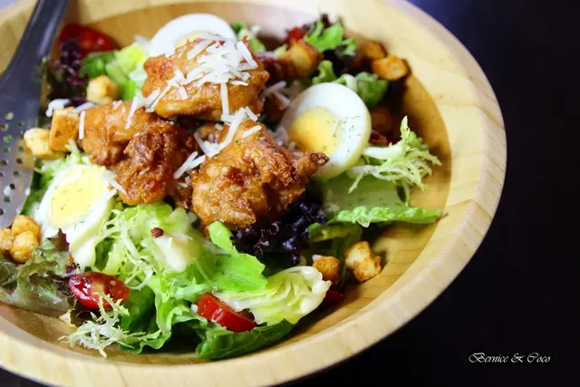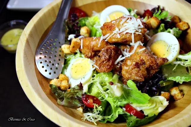 清爽開胃的招牌脆雞凱薩沙拉,亮麗的色彩一上桌就很吸睛