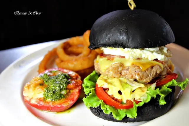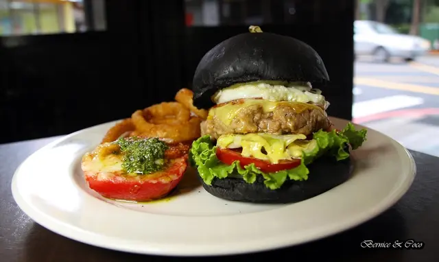 黑色的漢堡包是店家特製的墨魚汁漢堡,特製黑豬肉餅是現打手工製作,札實又多汁