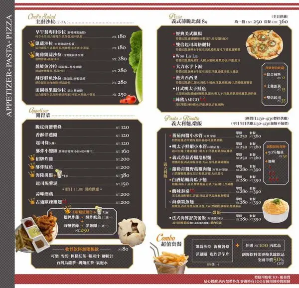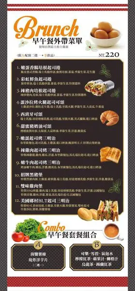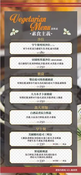 主要販售早午餐、義式料理、沙拉、甜點、飲料、開胃菜,也提供素食餐點及外帶服務。