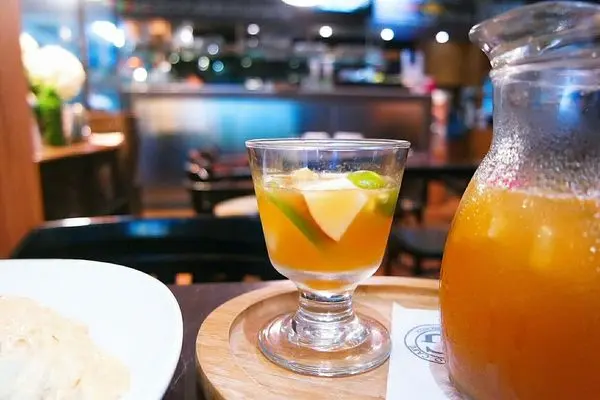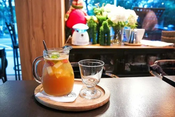 GOODY.O以可愛的木製小圓盤送上,上面擺放一大壺水果茶及透明玻璃杯,