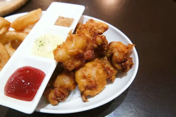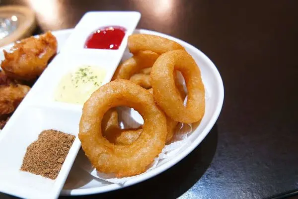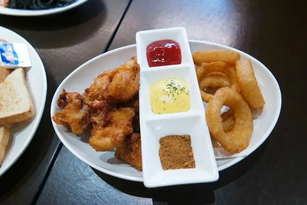 炸物可隨自已喜好沾取三種醬料:番茄醬、蜂蜜芥茉醬、店家特製香料。