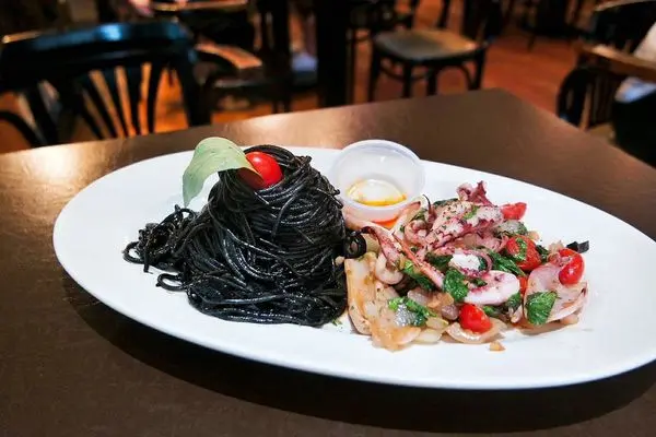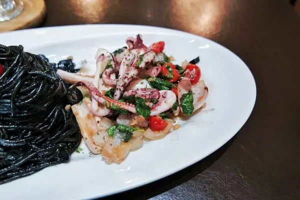 黑色麵條是白麵與墨魚汁炒成的墨魚麵,看起來Q彈有勁的魷魚也有試先炒過,