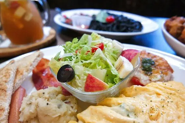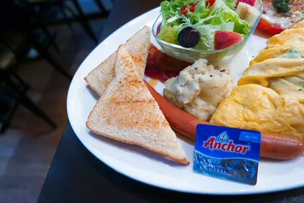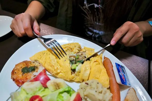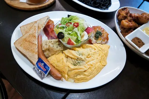 擺到快要沒有空隙的食物依續有脆腸、薯泥、吐司片、沙拉、奶油、培根、蕃茄以及海鮮歐姆蛋,