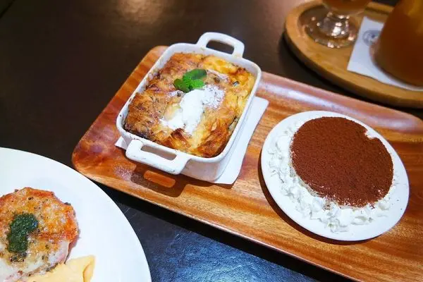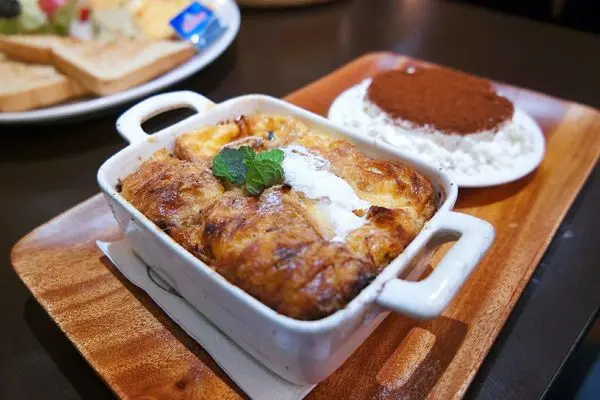 麵包烤布丁內裡柔軟香甜,藏有蘋果丁、酒釀葡萄乾,果香與蛋香在嘴裡蔓延,