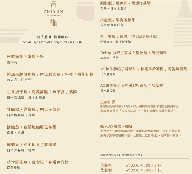 14品套餐2280元,可以加價400元升級成有帝王蟹的15品套餐,還有多款佐餐茶/佐餐酒可以加價選購喔~