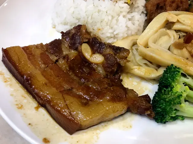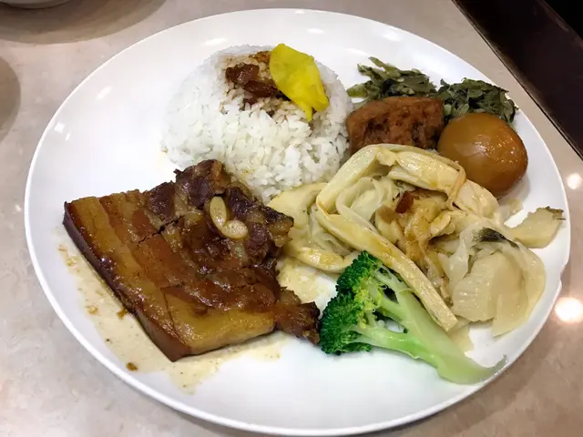 焢肉飯,配菜有荀絲、油豆腐、酸菜、花椰菜、滷蛋,整個就是南部的作法,飯會淋上滷汁,吃起來更有味。焢肉滷的很入味,肥的部分吃起來很Q,不會軟軟太膩的感覺,一口下去有肥有痩的口感最好吃。
