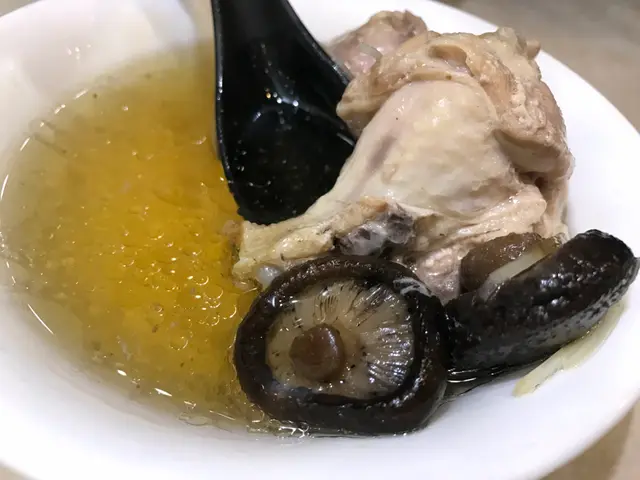 香菇雞湯,看起來油喝起來卻不膩,有一隻雞腿和翅及兩個香菇,用料算是蠻實在的,雞肉因爲一直在蒸籠己悶很久,肉和骨頭一咬就分離好入口,不論是配飯或米糕都不錯,天氣冷也順便補補身子。
