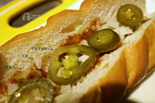 裏頭的配料酸黃瓜、洋蔥、番茄醬,還有最厲害的墨西哥辣椒