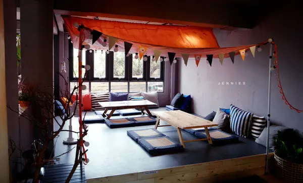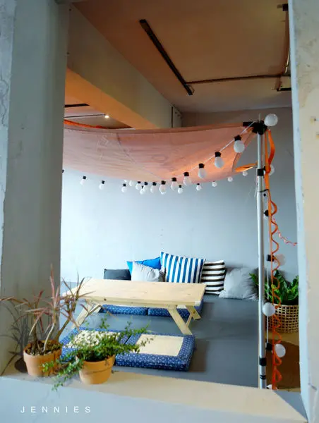 把戶外風景帶進室內空間,到處有綠色的植物、柔軟的布織品,加上頭頂天花板上的布料及燈飾,晚上一定很浪漫這個地方!