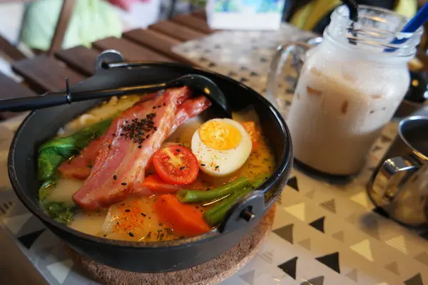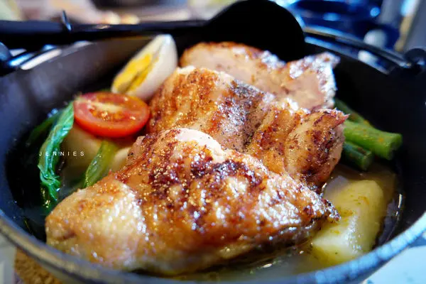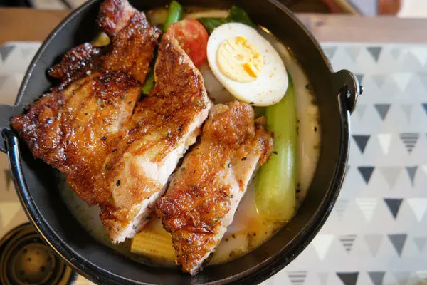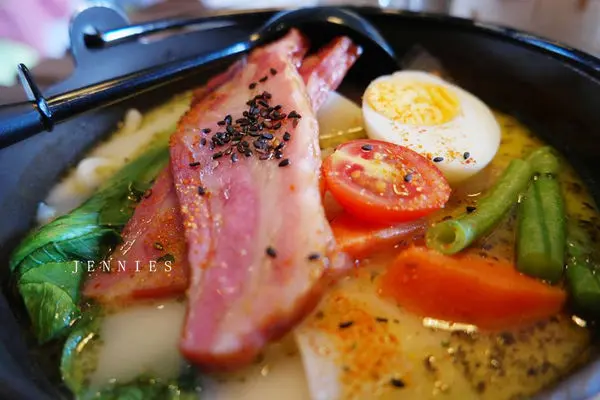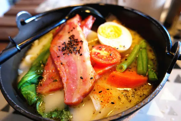 這裡使用的培根厚切足達1公分,是五星級飯店最常使用的台灣有機飼養豬;而小卷來自萬里;有分奶油及咖哩的湯底,咖哩略帶微辣。
