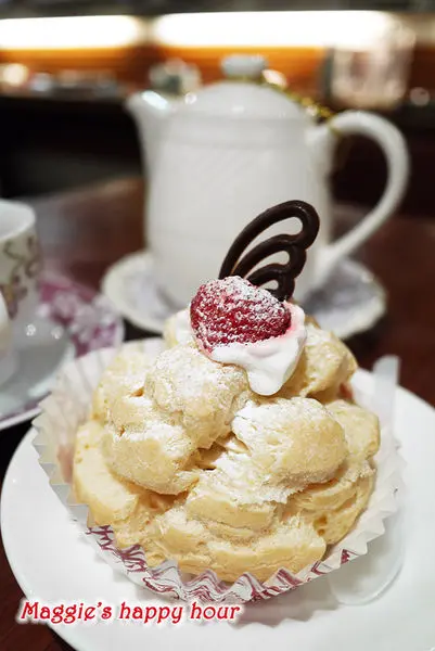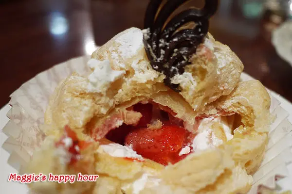 搭配的甜點是「草莓堡」,其實就是草莓泡芙,這泡芙是傳統口味,在冰箱冰過後外層的皮就變軟了,味道也就沒有那麼好。