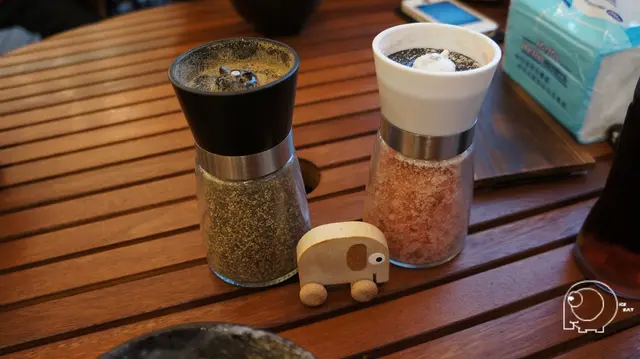 桌上擺著二瓶調味料一瓶胡椒粉一瓶玫瑰鹽