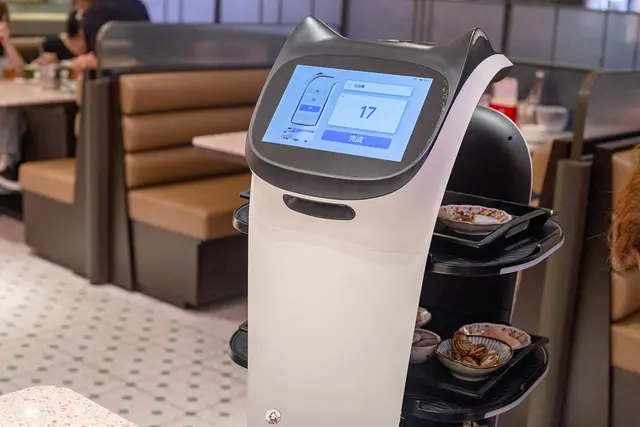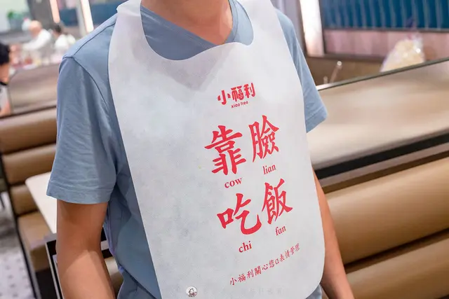《小福利麻辣鍋》是用手機掃QR碼點餐,點完餐服務人員會把食材送上桌,然後這裡也有送餐機器人叫阿福,送餐速度是蠻快的,不管是人工還是機器人都值得讚賞一下,而且隨時都會有人來收餐盤,用餐會有圍兜兜,真的覺得超難用,太長又硬,涮肉拿東西都卡卡的,只是上面靠臉吃飯四個字還蠻好拍照的。