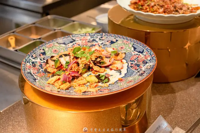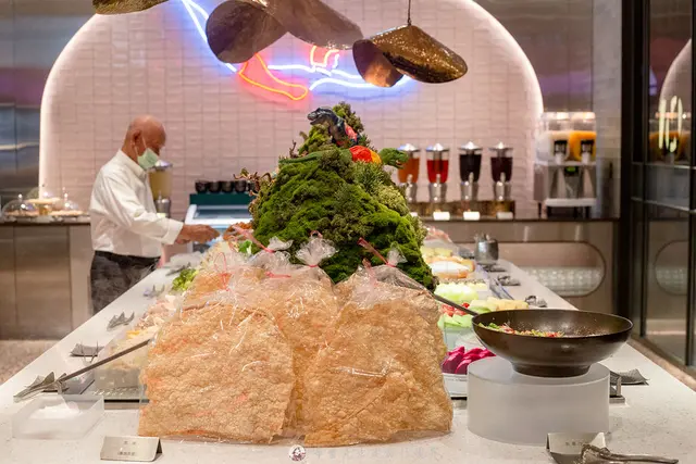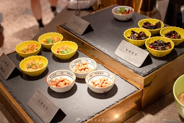 自助區的中島一邊是甜點水果,另一邊則是新鮮疏菜,都有冷藏保溫,蔬菜、火鍋料種類也很多,還有超大片的豆皮,火另外還有鍋料及泡麵之,裝蔬食的盤子還蠻有趣的。