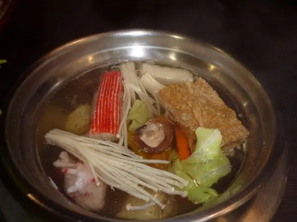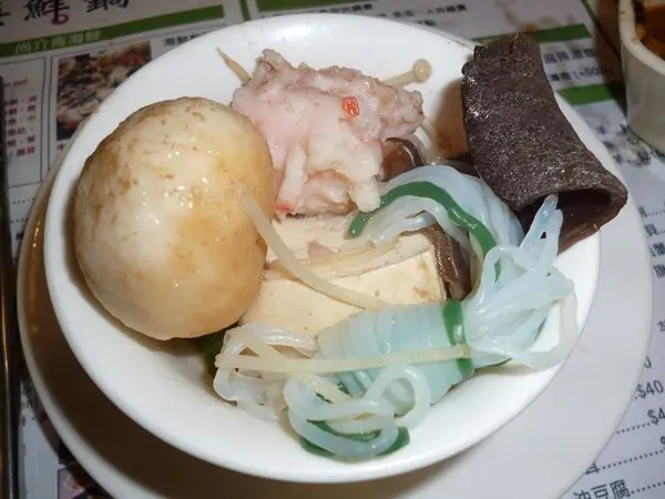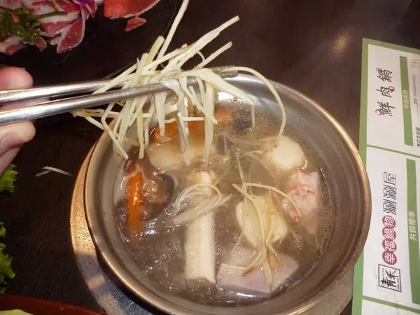再送上主食前,先送上豐盛的菜盤.菜盤內包括份量很多的高麗菜,大陸妹,以及蝦丸,豆腐,芋頭塊,豆皮,南瓜塊,木耳等等.這些菜盤內的食材,慢慢夾入滾燙的火鍋中,等到煮熟再慢慢撈起,沾上醬料食用.我個人比較喜歡起士丸,因為一咬下去,可以吃到濃郁的起士.紅蘿蔔經過滾燙有明顯的甜味,芋頭放入火鍋煮熟,吃起來的口感綿密鬆軟.