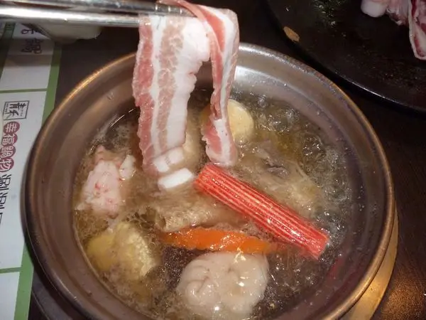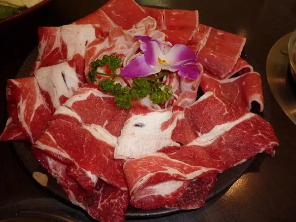 沙朗牛肉肉質鮮紅,油脂分佈比安格斯牛小排的肉質多一點,吃的方式也是和安格斯牛小排相同,必須在去熱湯裡打滾一下,吃起來的口感,我覺得肉質稍微有點硬,也吃到一點筋,但牛肉肉質仍然不失鮮嫩美味.