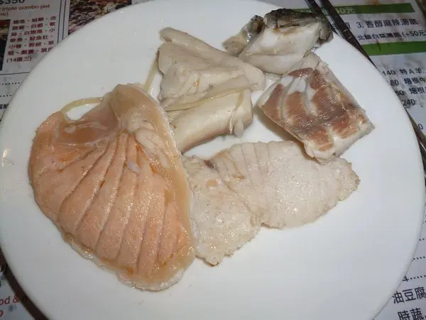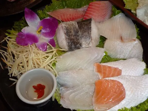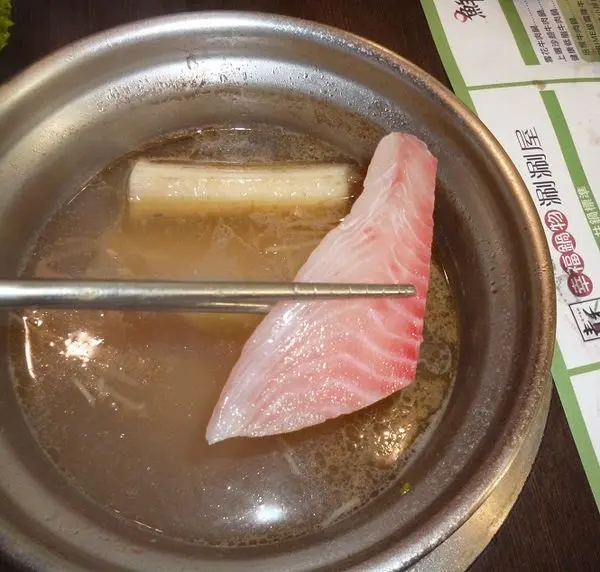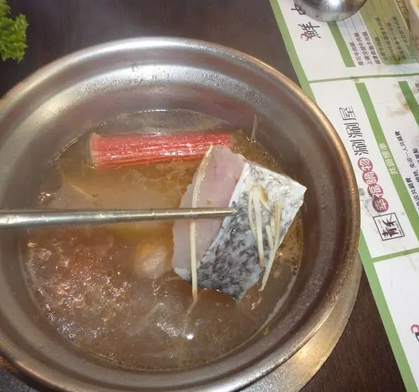 魚片陸續丟入鍋中稍微滾煮一下,把煮熟的魚片放在盤子上品嚐.這五種魚類,我個人比較喜歡鮭魚肚的滋味,因為鮭魚肚的油脂,把鮭魚的鮮美滋味突顯出來.再來是鱸魚,吃起來的味道,肉質鮮嫩美味.