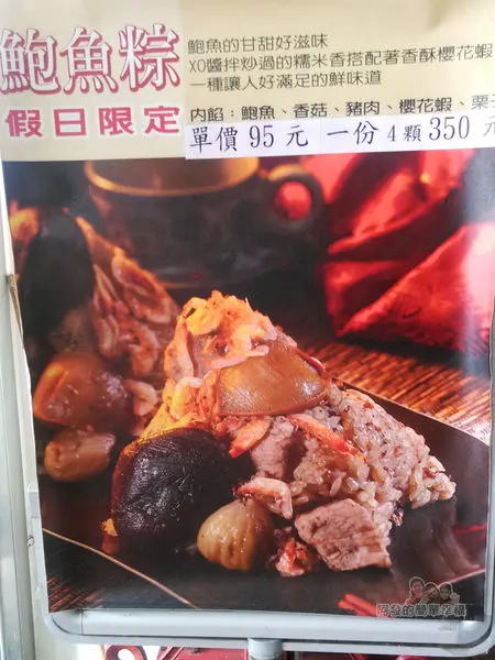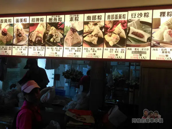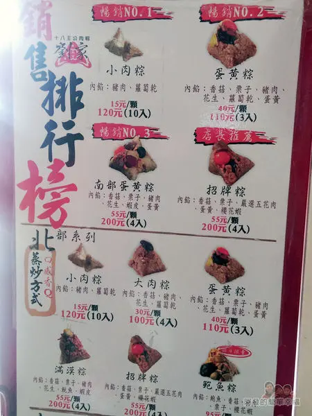 北部粽:小肉粽15元、大肉粽30元、蛋黃粽40元、滿漢粽55元、招牌粽55元;