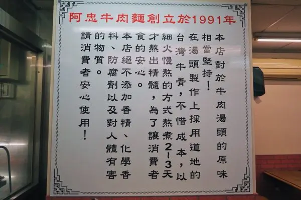 店內的牆上還寫著阿忠牛肉麵對自己產品的堅持,