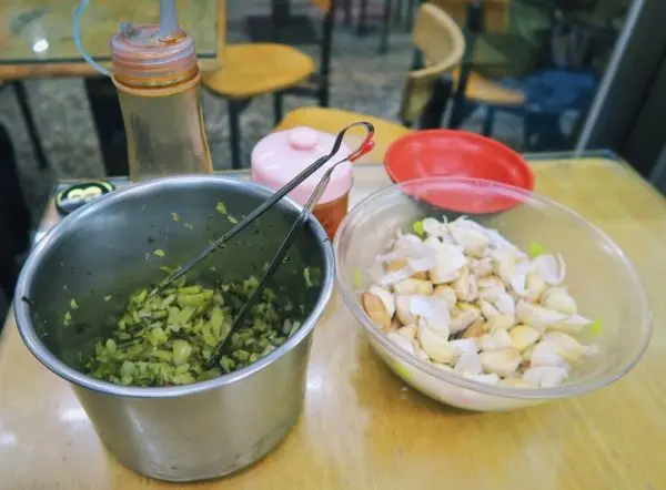 店家旁邊也有放上佐料, 有大蒜跟酸菜, 喜歡的人可以自取,