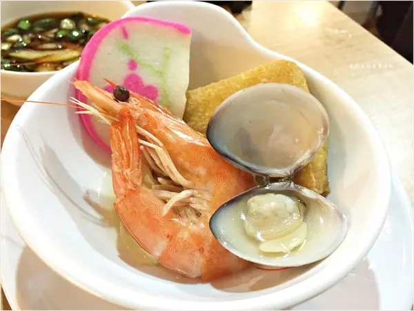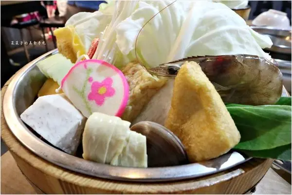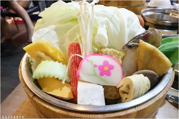 菜盤用木盆裝感覺好有份量,裡面除了火鍋料還有蝦子蛤蜊。