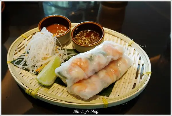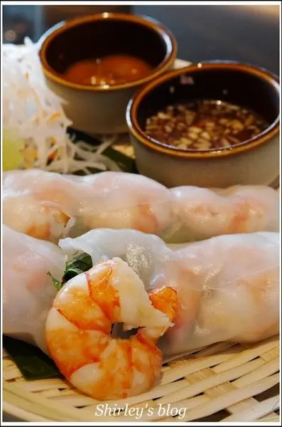 透明米紙包入川燙過的蝦肉,以及生鮮的紅蘿蔔絲、黃瓜絲、生菜、九層塔及薄荷葉