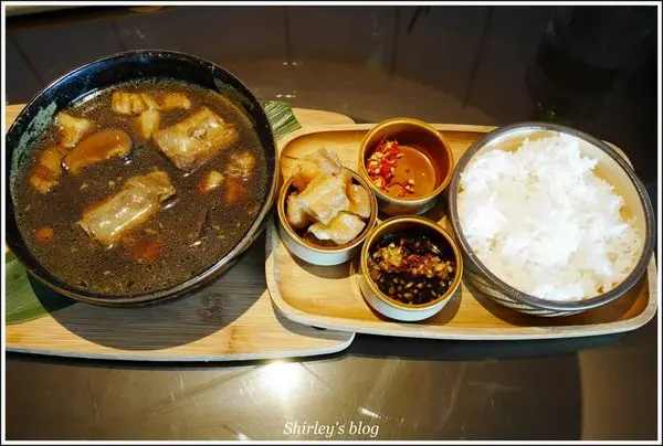 份量十足的肉骨茶還有一大碗白飯及油條、沾醬、辣椒