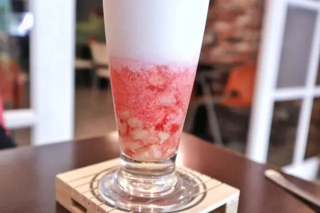 草莓沾上草莓巧克力奶泡酸酸甜甜,入飲順口又有草莓甜甜的果肉,果真是戀愛的滋味阿!