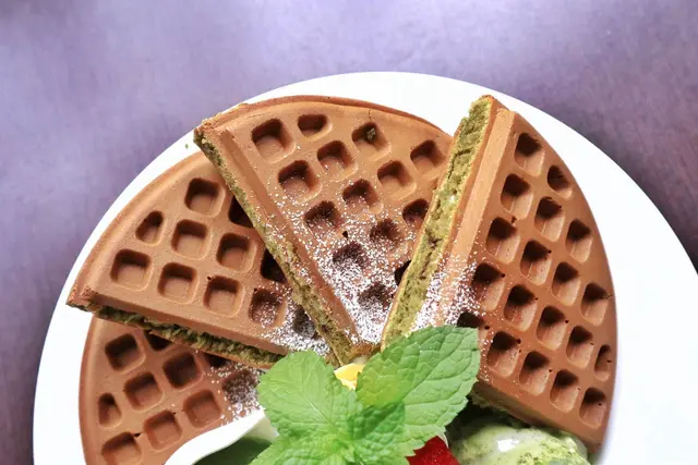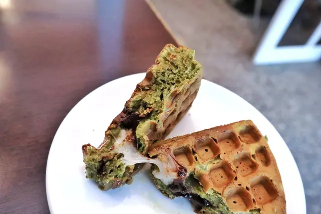 ▲鬆餅的厚度頗豐、表皮脆口內裡鬆軟,有著淡淡的抹茶風味,切開來裡面還藏有小驚喜QQ麻吉、紅豆,