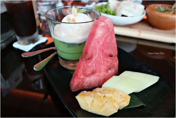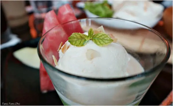 季節水果今日提供的是西瓜、鳳梨和香瓜,自製薄荷鳳梨凍上頭放了一球冰淇淋,