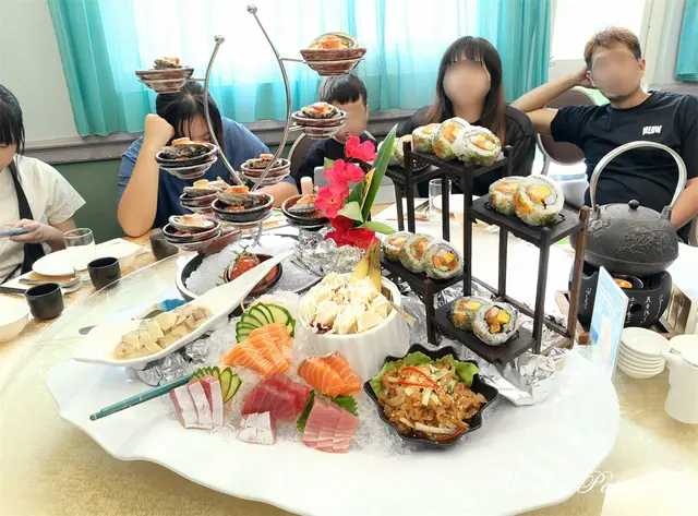 拚盤有生魚片、鮑魚、醉雞、海蜇皮、涼筍及花壽司,