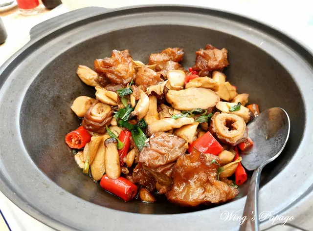 三杯肥腸軟嫩易入口,有醬汁香氣,搭配杏鮑菇,吃來有Q勁。