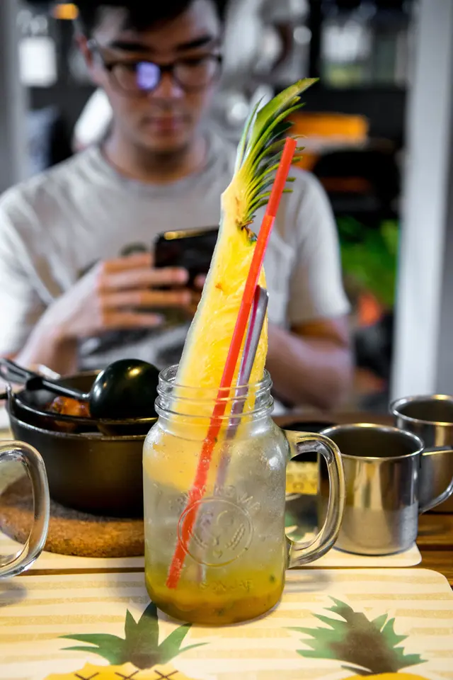 浮誇系飲料第二彈! 一整支鳳梨連果肉直接放入杯子中,杯底是酸甜的百香果