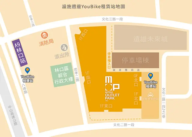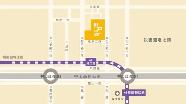 如果選擇搭乘MRT桃園機場捷運線,坐到A9林口站下車步行大約10分鐘就可以到達,