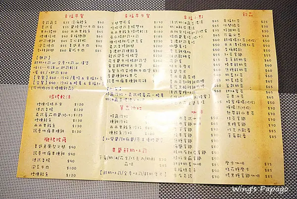有早餐、早午餐、三明治、義大利麵、燉飯、鬆餅、小點、各式飲品等,