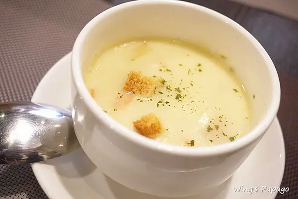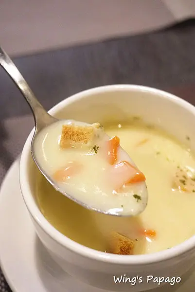 早午餐附的奶油蔬菜濃湯有紅蘿蔔、洋蔥、吐司丁等配料,